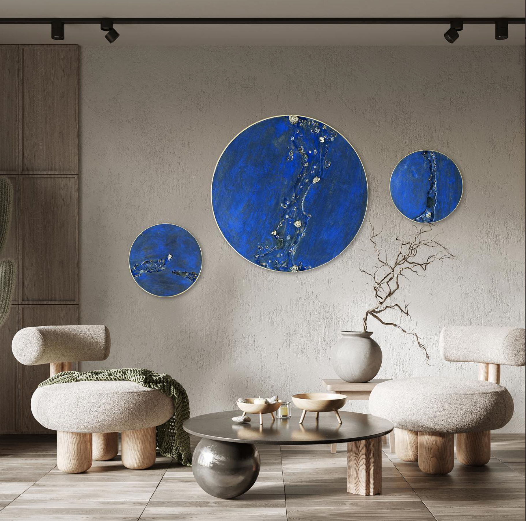 Marike Weysenfeld is an intuitive artist who creates personalized artworks using high-quality gemstones, gold leaf, and durable pigments, all framed in naturally shaped brass.
